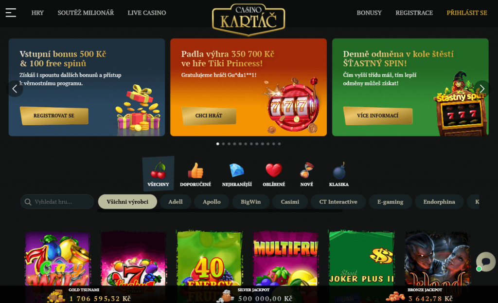 Kartáč Casino je licencované online kasino patřící pod společnost Casino Kartáč Group a.s., známou svými kamennými kasiny v Ostravě a Opavě. Kasino je licencováno Ministerstvem financí ČR a nabízí hráčům širokou nabídku her, atraktivní bonusy a pohodlné způsoby vkladů a výběrů.