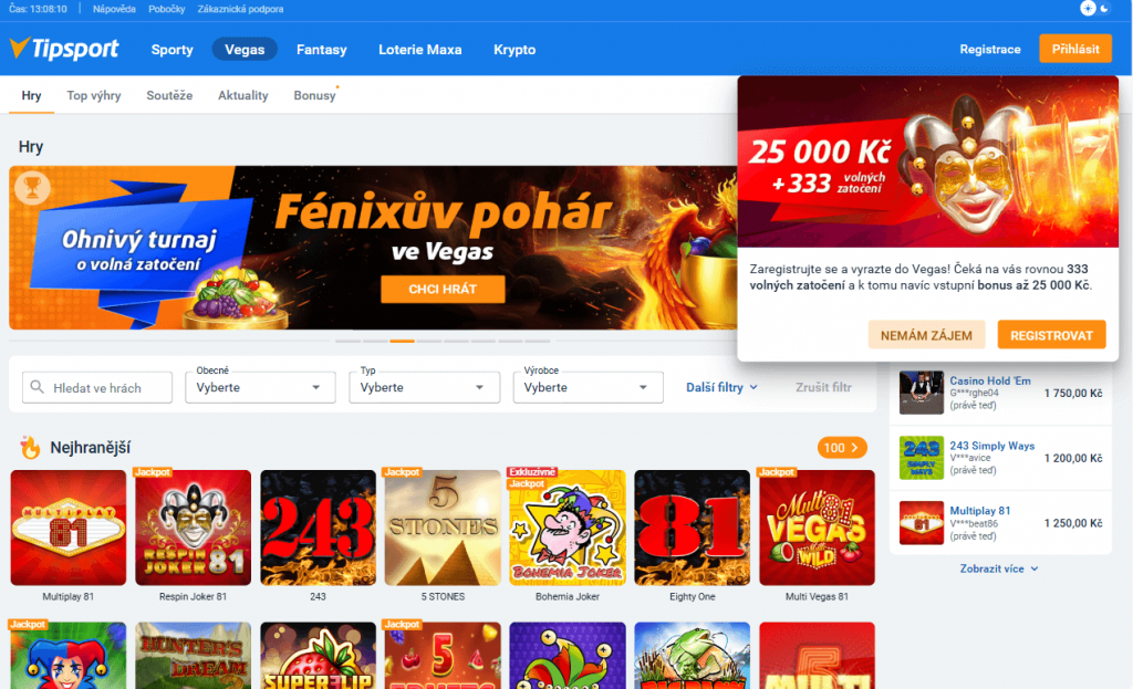- Pravidelné promoakce: Tipsport Vegas pravidelně pořádá různé promoakce, jako jsou turnaje, cashbacky a další speciální nabídky pro stálé hráče.